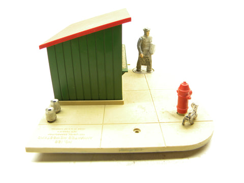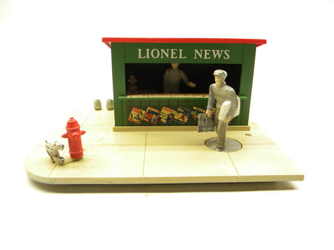Lionel 128 Animated News Stand 1957-1960 Has Original Newspaper When you turn it on the newsman behind the counter moves back and forth, the light on the news counter lights up, the newsboy out front turns from side to side with the newspaper in his hand, and the little dog runs in circles Measures 8 1/2 inches long x 6 1/2 inches wide x 4 inches tall. Tests Good Very Good Condition